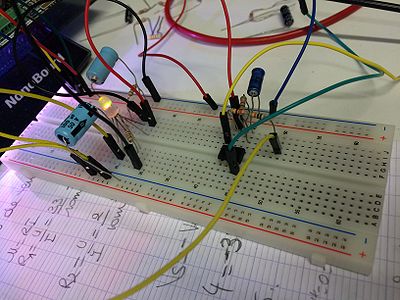 Enfin, nous devions relier la sortie de la Nanoboard au filtre passe-bas déjà réalisé, puis il fallait relier la sortie de ce filtre aux différentes parties du montage. Chaque montage correspondait à une paire de LEDs: le diviseur de tension pour les LEDs rouge et verte et l'amplificateur opérationnel pour les LEDs bleues.