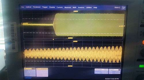 En évitant de passer par l’antenne patch , et en connectant directement l’antenne du module d'émission ( fil + GND) à l’oscilloscope via un câble coaxial , j’ai pu visualiser le signal prévu :
