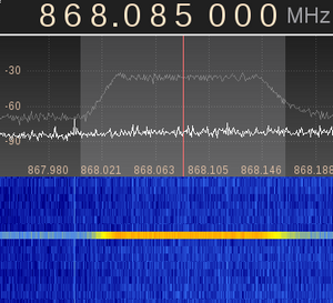 Le code d'un end-device s'intègre parfaitement sur la radio SX1276, prévue à cet effet. J'ai pu donc effectuer mes premiers essais d'émission. A gauche, on a le spectre observé à l'aide d'une radio logicielle pour les paramètres suivants :