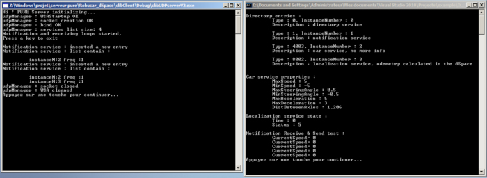 Après avoir intégré la librairie Clib permettant de modifier les valeurs de la dSpace dans le code du serveur PURE, des tests ont été tentés sur le PC du robuCAR. Malheureusement, le développement ayant été effectué sous Visual C++ 2010 (une version présente sur le pc robuCAR, mais non utilisé par les projets précédemment réalisés), nous avons rencontré une grande liste de soucis avec la librairie Clib. Celle ci était en effet livrée pré-compilée et sans les sources. Il y a donc incompatibilité avec les librairies standards de Visual c++ 2010 et celles utilisées dans Clib. Il a donc fallu modifier le projet contenant le serveur PURE afin de le faire passer sous visual c++ 2005. Lors de ce passage, l’installation et l’utilisation la librairie boost a été nécessaire, car les objets de type shared pointers ne sont pas disponibles avec Vc++2005. De plus l’initialisation de l’objet critical section a aussi du être modifiée. Une fois le programme adapté, une correspondance entre les valeurs à lire et écrire par le serveur et les emplacements mémoire de la dSpace a été effectuée grâce au fichier de configuration de la bibliothèque clibClient, développé auparavant. Un autre souci est alors apparu : la bibliothèque Clib ne fonctionne pas lors d’un appel via le thread. Les outils de débogage n’ont pas indiqué de différences des données lors de l’appel aux fonctions, mais le problème reste entier. Le fonctionnement du serveur est donc modifié afin de n’avoir qu’une boucle principale avec la réception de paquets (avec timeOut) puis l’appel aux notifications sortantes.