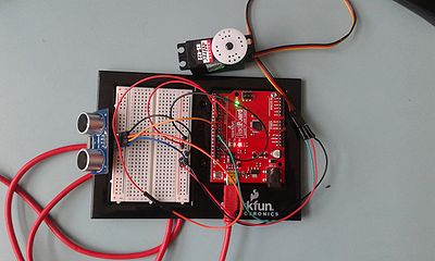 - Concernant la partie électronique, nous avons commencé la séance par créer un prototype Arduino pour pouvoir tester le bon fonctionnement du sonar ultra-sons et du servomoteur, et de voir comment s'utiliser ces 2 composants. Nous avons donc réussi à faire tourner le servomoteur en continu pour un angle de 0 à 180° tout en récupérant la distance de l'obstacle le plus proche avec le sonar.