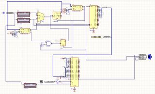 Schéma électronique final et fonctionnel (Altium Designer). La sortie de l’émission est raccordée à la réception pour test. Schéma fonctionnel, la bascule D est maintenant asynchrone, et effectue donc bien le clear.