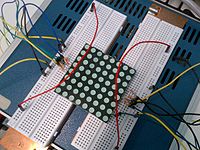 Remarque: le câblage correct du circuit a été obtenu après plusieurs séances supplémentaires. En effet, nous avions fait une erreur d'inattention en câblant des broches voisines sur une moitié de la matrice. De plus, nous avions branché les résistances sur les broches "colonne" de la matrice, ce que nous avons rectifié, le contraire étant plus simple et moins encombrant visuellement.