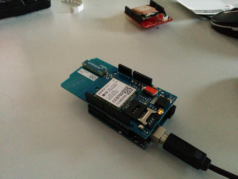 Arduino avec un shield GSM monté dessus.