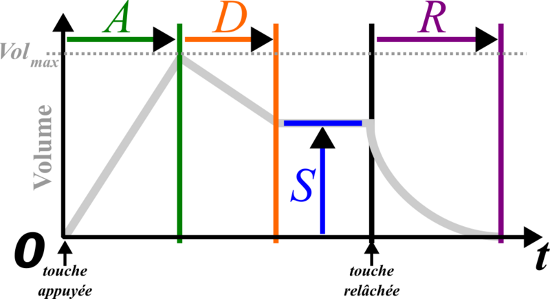 Révision datée du 18 juin 2017 à 23:28 par Gbontoux (discussion | contributions) (Graphique original de Wikimedia Commons sous license Creative Commons Attribution-Share Alike 3.0 Unported Modifié par Geoffrey Preud'homme https://commons.wikimedia.org/wiki/File:ADSR_parameter.svg)