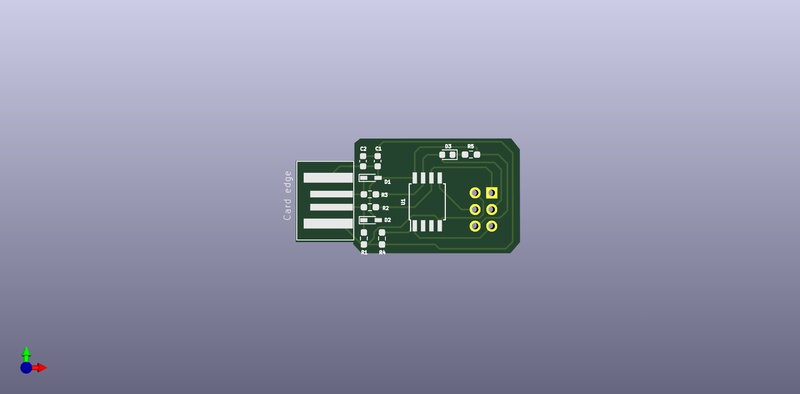 Révision datée du 10 octobre 2022 à 10:19 par Edescarp (discussion | contributions) (Nous avons cette fois la vue en 3D de la carte. Nous avons travaillé avec l'éditeur de circuit imprimé de kicad. Nous avons donc placé chaque composant pour donner une forme de clé, puis nous avons fait les liaisons et le contour.)