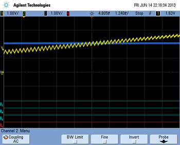 Le système est constitué d'une bascule RS, qui permet lorsque pour la première fois la sortie du comparateur passe à 1, de mettre la sortie de la bascule à 1, ensuite quelque soit la valeur de la sortie du comparateur, le résultat de la bascule RS reste inchangé, puis lorsque l'on arrive en fin de la période de la PWM, la donnée de la bascule RS passe à 0. Le signal corrigé est le signal rose du schéma 1.