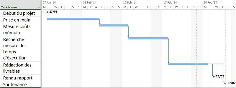 Révision datée du 25 février 2014 à 10:29 par Mlelaure (discussion | contributions) (Diagramme de Gantt du PFE sur l'évaluation du coût des threads dans un système temps réel.)
